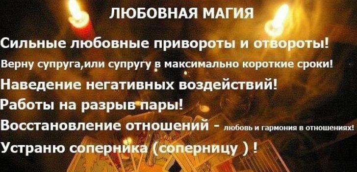 Сильнейший приворот от мага высшей категории, работаю по всей России, верну любимых, разожгу чувства. Любовная магия- в ней нет мне равных. Не важно как давно вы расстались. Все делается на молитвах, никакого вреда вам не будет. Устраню соперницу, делаю рассорку на любовников, они будут ссориться как кошка с собакой, расстанутся навсегда. Если вам плохо и больно обращайтесь помогу. Если вы одиноки и вам трудно встретить свою вторую половину. Я просмотрю ситуацию и в скором времени вы не будете одни. Сниму порчу, сглаз, проклятие. Сниму венец безбрачия.
